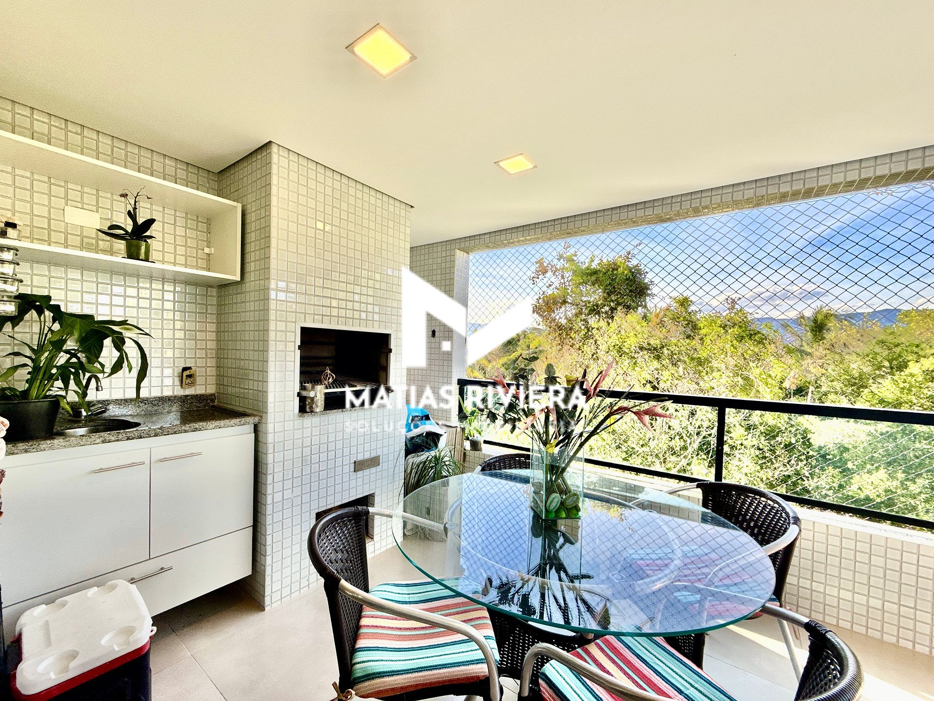 Varanda com rede de proteção e churrasqueira